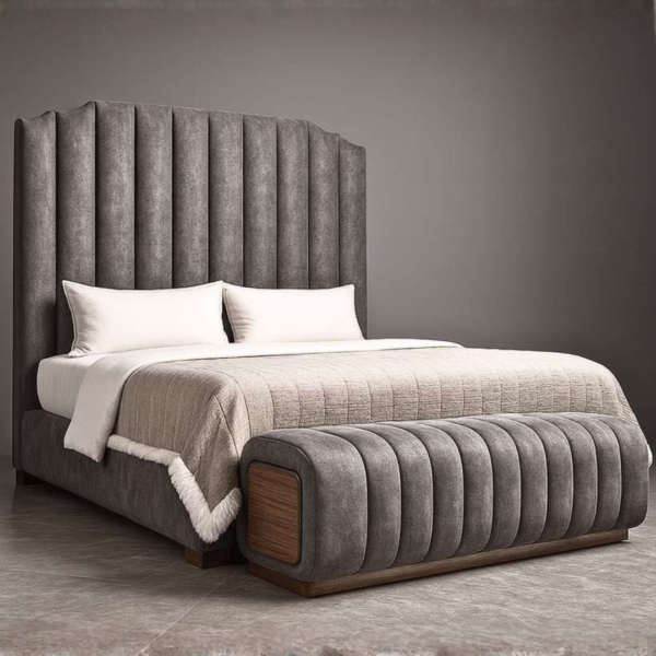 Franjas, soclo en madera sólida de nogal, tapicería en tela.