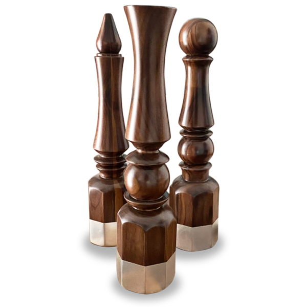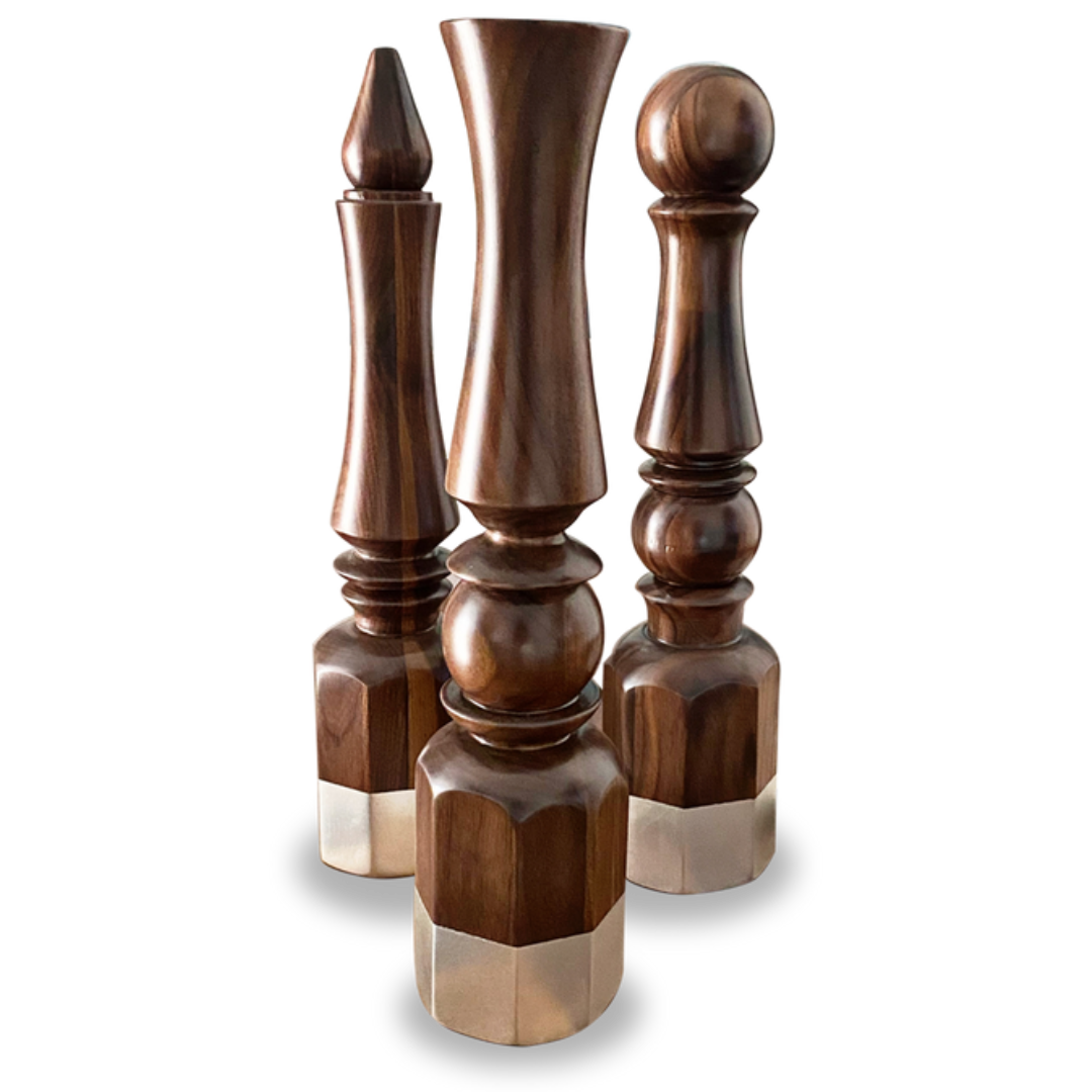 Set (3) Ajedrez, en madera sólida de nogal con detalle en hoja de plata.