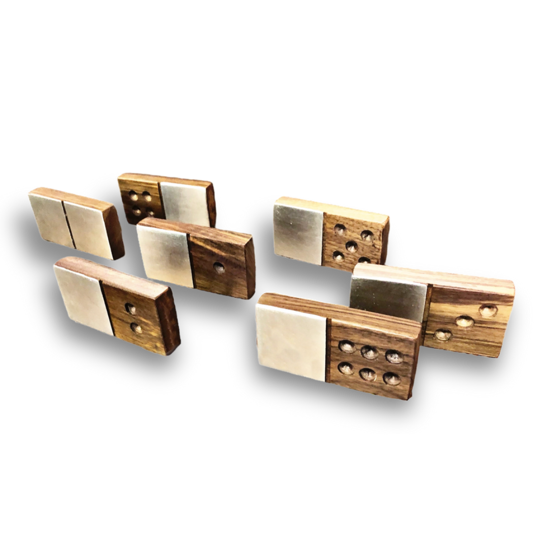 Set (7) fichas de Domino, en madera sólida de nogal, detalle en hoja plata.