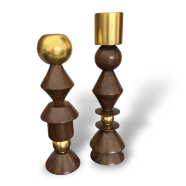 Set (2) Escultura Lisboa, en madera sólida de nogal, detalle en hoja de oro.